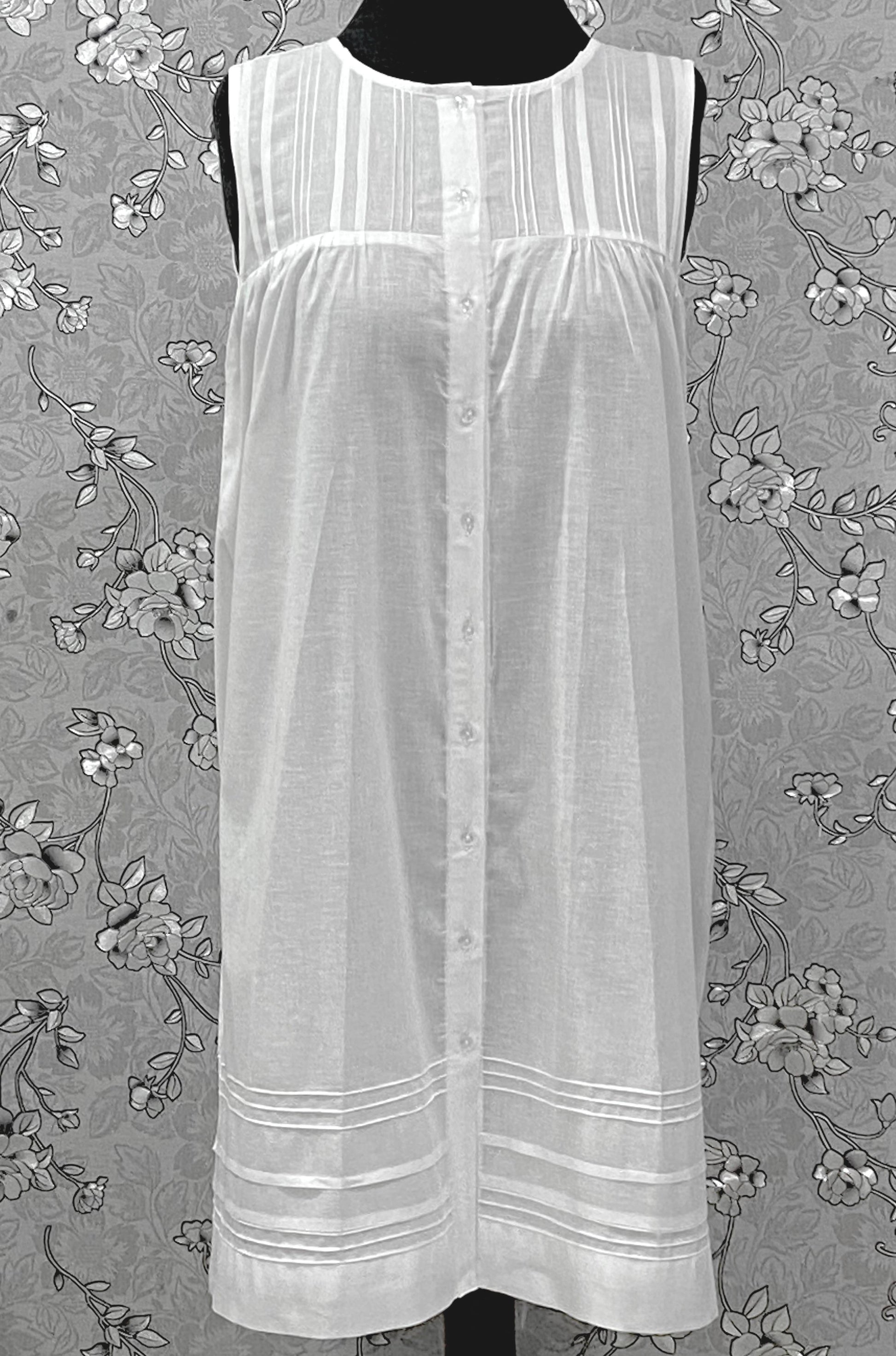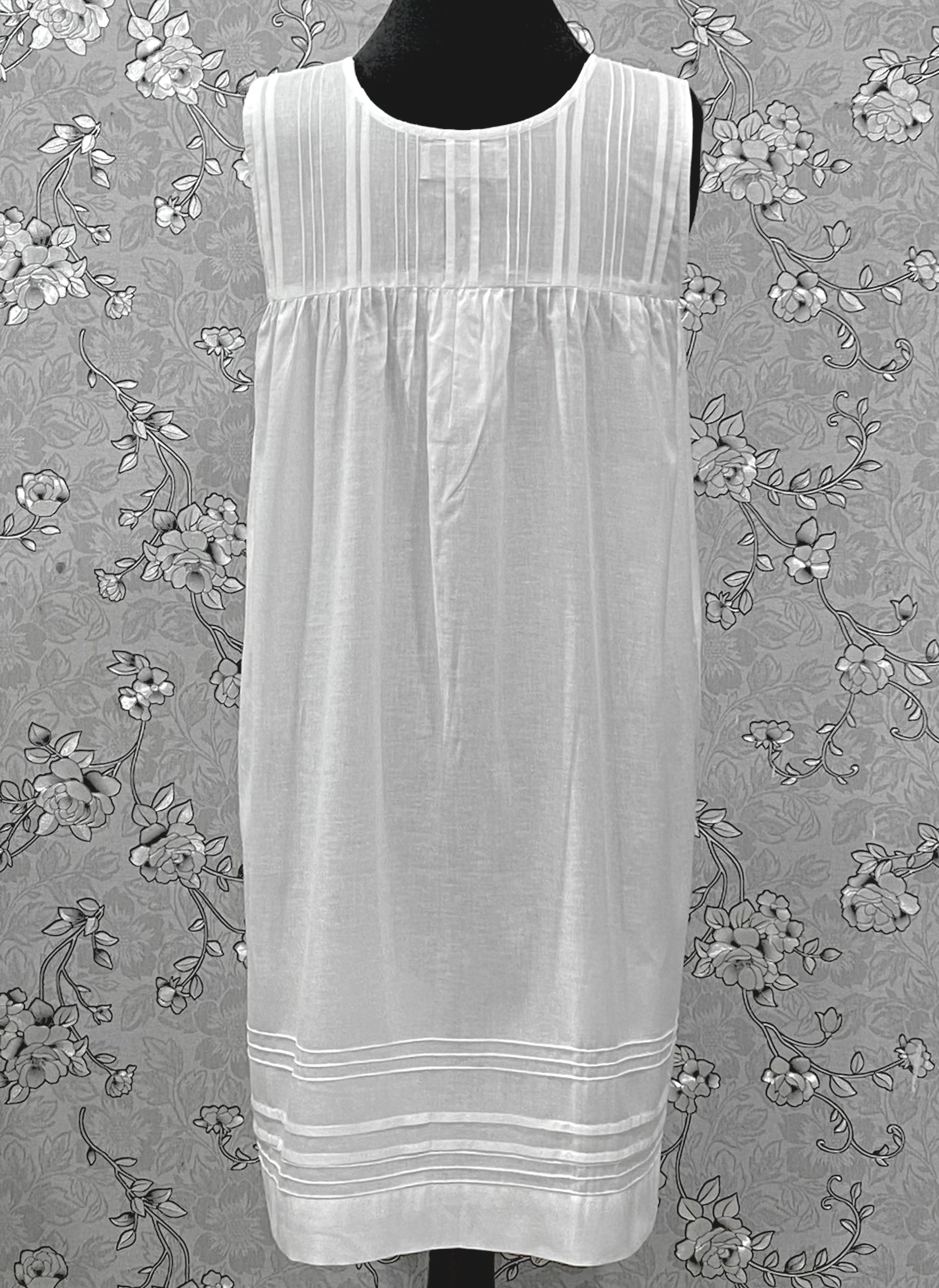 Graceful, light, and endlessly classic — this SoieRose Victorian nightgown in soft 100% cotton embodies the quiet luxury of vintage sleepwear. The sleeveless cut and button-front design make it an ideal choice for warm nights, while the pin-tucked bodice and delicate lace trim lend a timeless Victorian charm. Its breathable cotton fabric ensures cool comfort through every season, whether lounging or sleeping.
