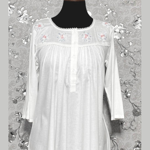 Embrace classic elegance with the SoieRose Victorian Nightgown, meticulously crafted from 100% pure cotton for a soft, breathable feel. This long-sleeve nightgown in pristine white features delicate subtle blue and pink embroidery, adding a touch of understated charm and sophistication.