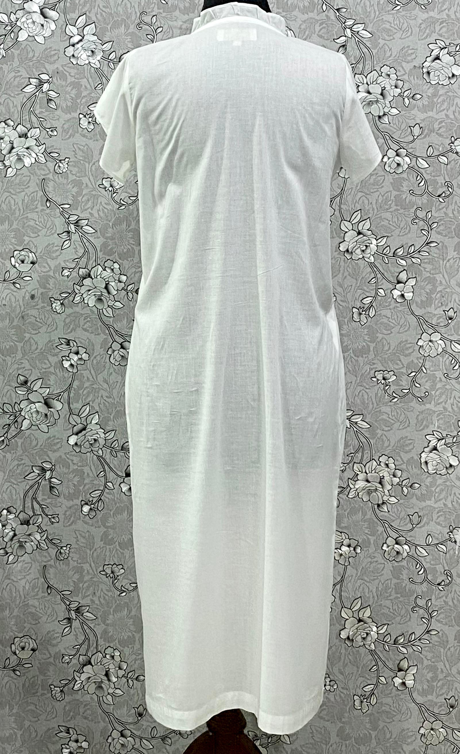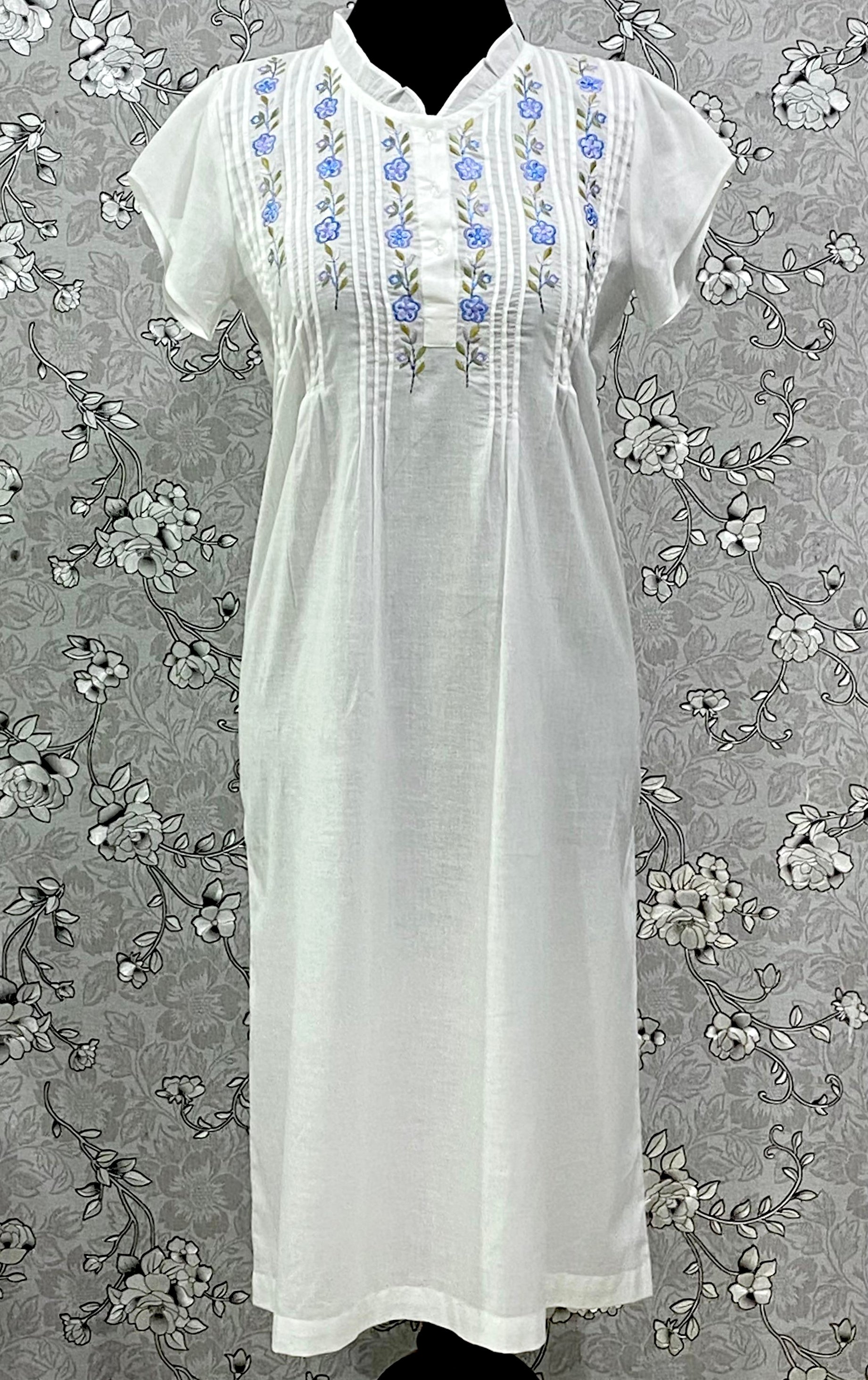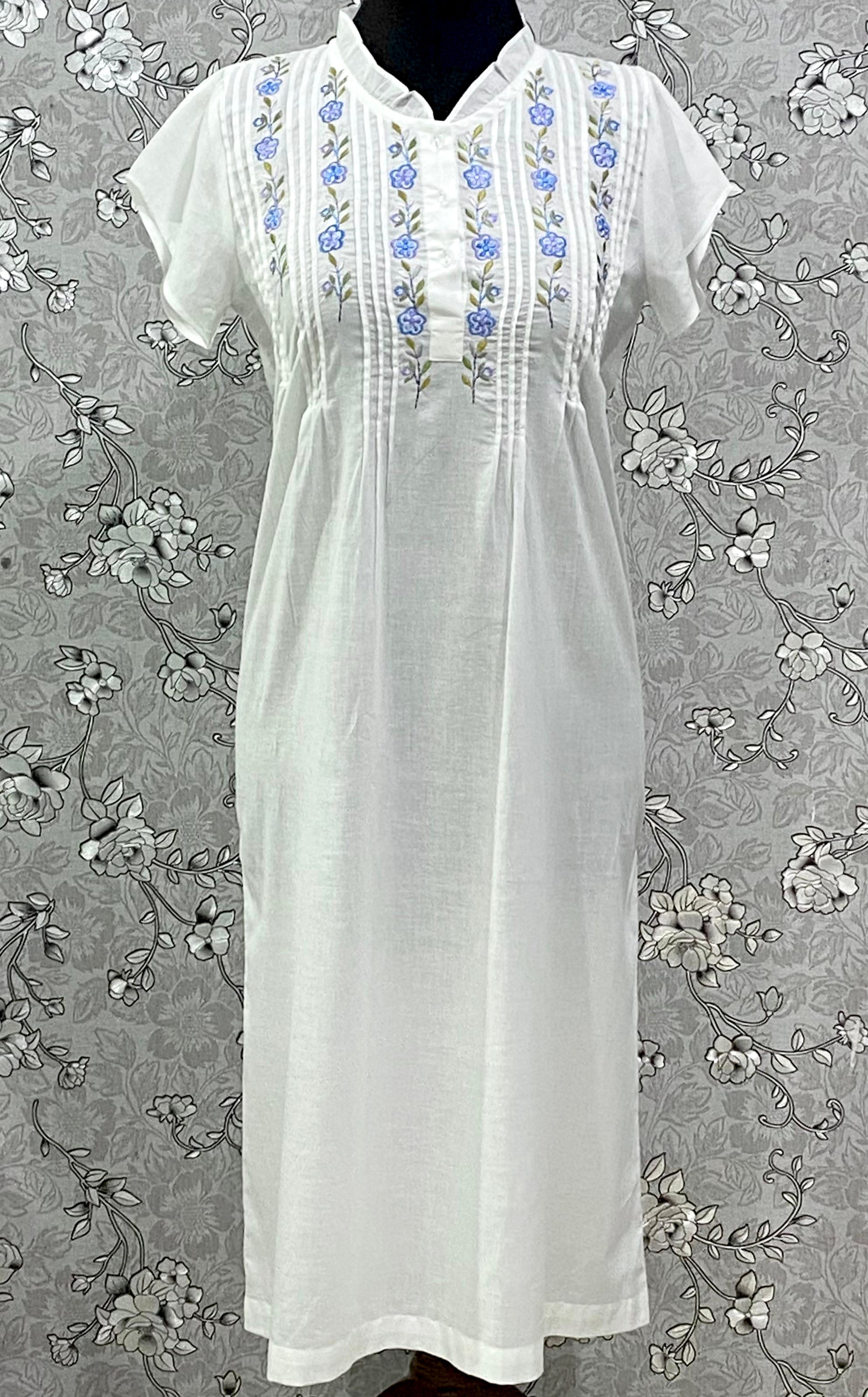 SoieRose Cotton Nightgown – SR-1196 – White Victorian Nightdress with Blue Floral Embroidery
