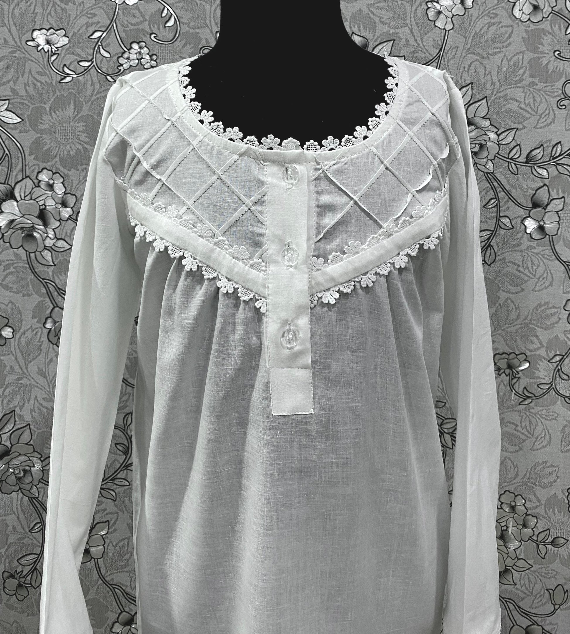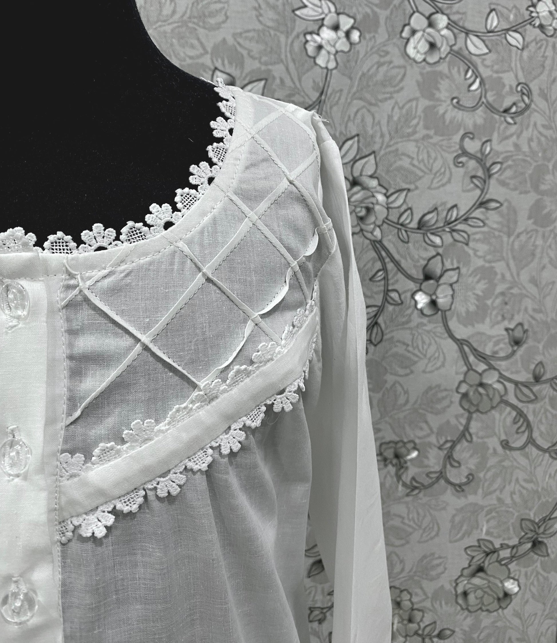 This exquisite SoieRose Victorian-style heirloom nightgown is tailored in 100% breathable cotton, featuring long sleeves with lace-trimmed cuffs and delicate front panel embroidery. The intricate pintuck detailing and buttoned placket add timeless charm, making it perfect for cool nights, portraits, or special keepsake moments.