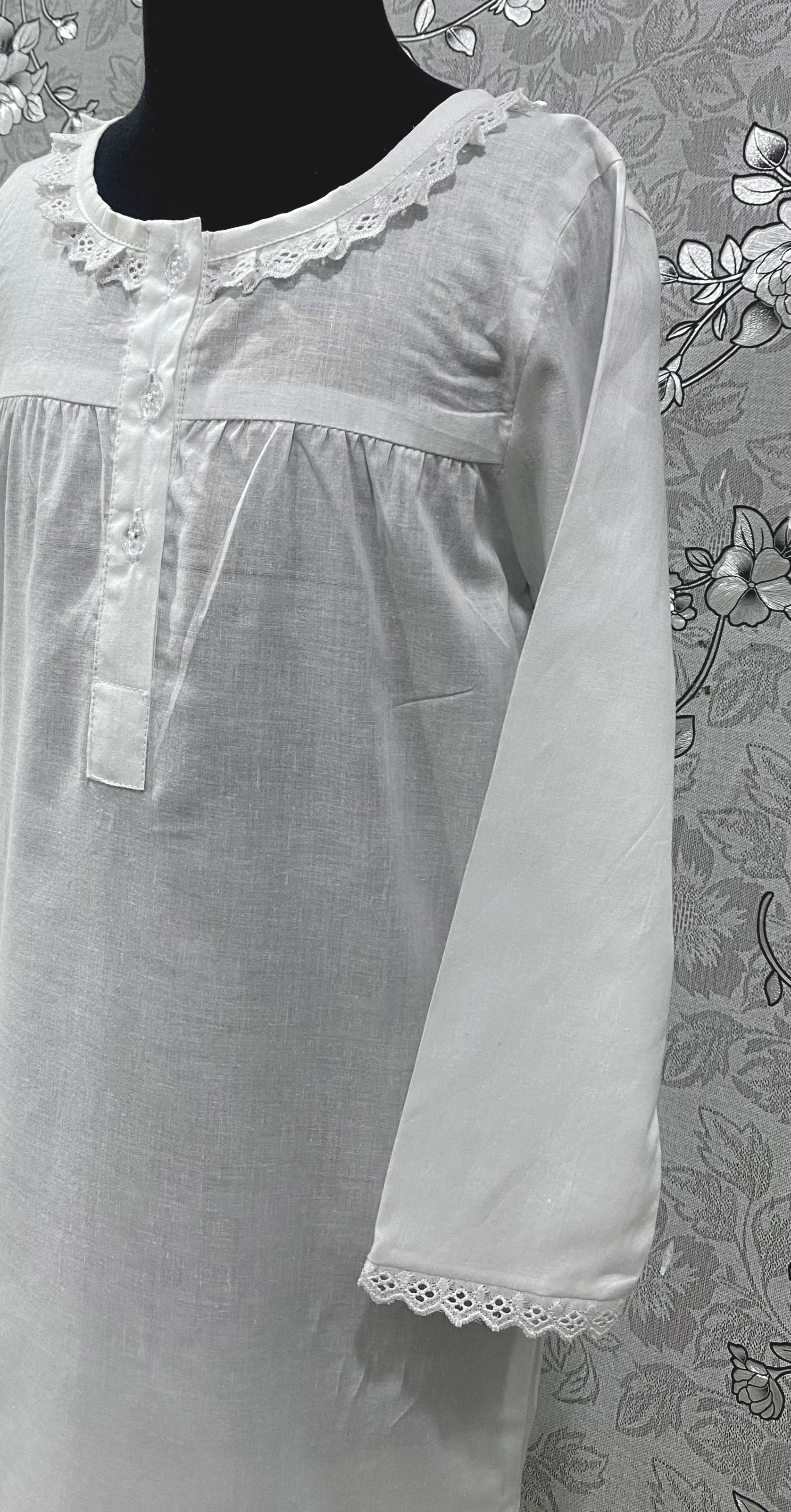 This graceful long-sleeve heirloom nightgown by SoieRose brings timeless Victorian elegance to your little one’s bedtime. Expertly crafted from 100% soft cotton, it features delicate lace trim on the neckline and cuffs, creating a charming and classic silhouette. Perfect for cozy nights, portraits, or special family occasions.