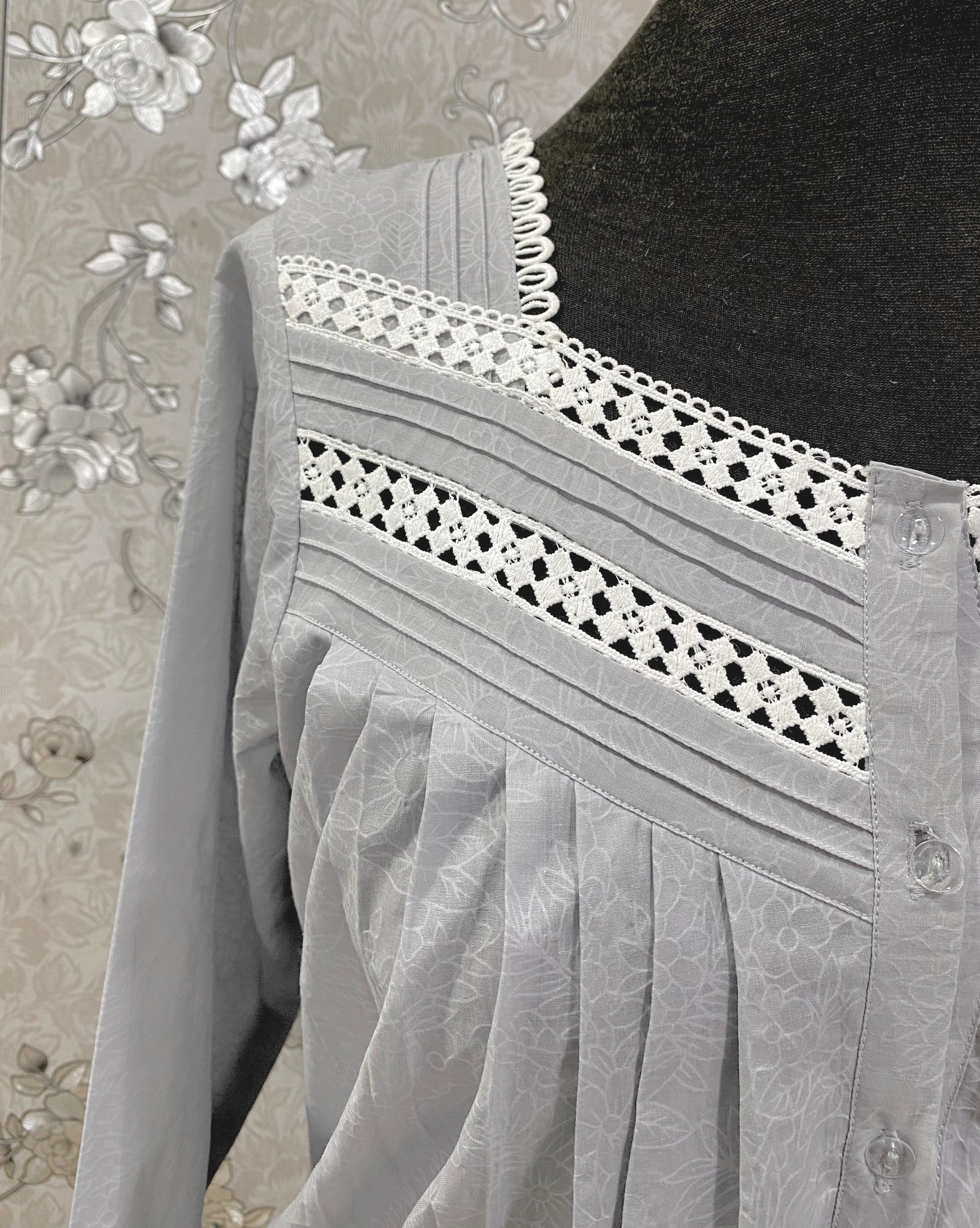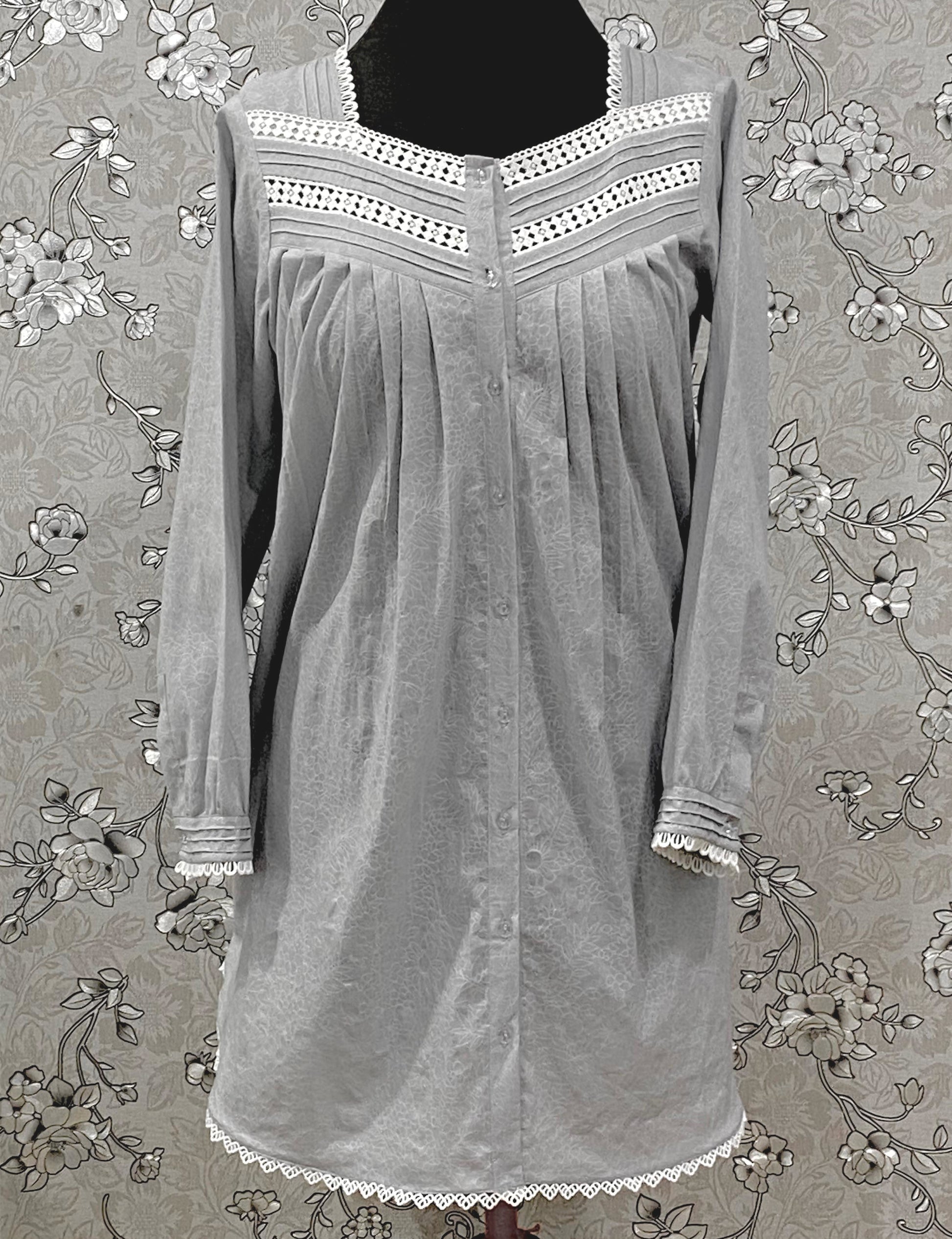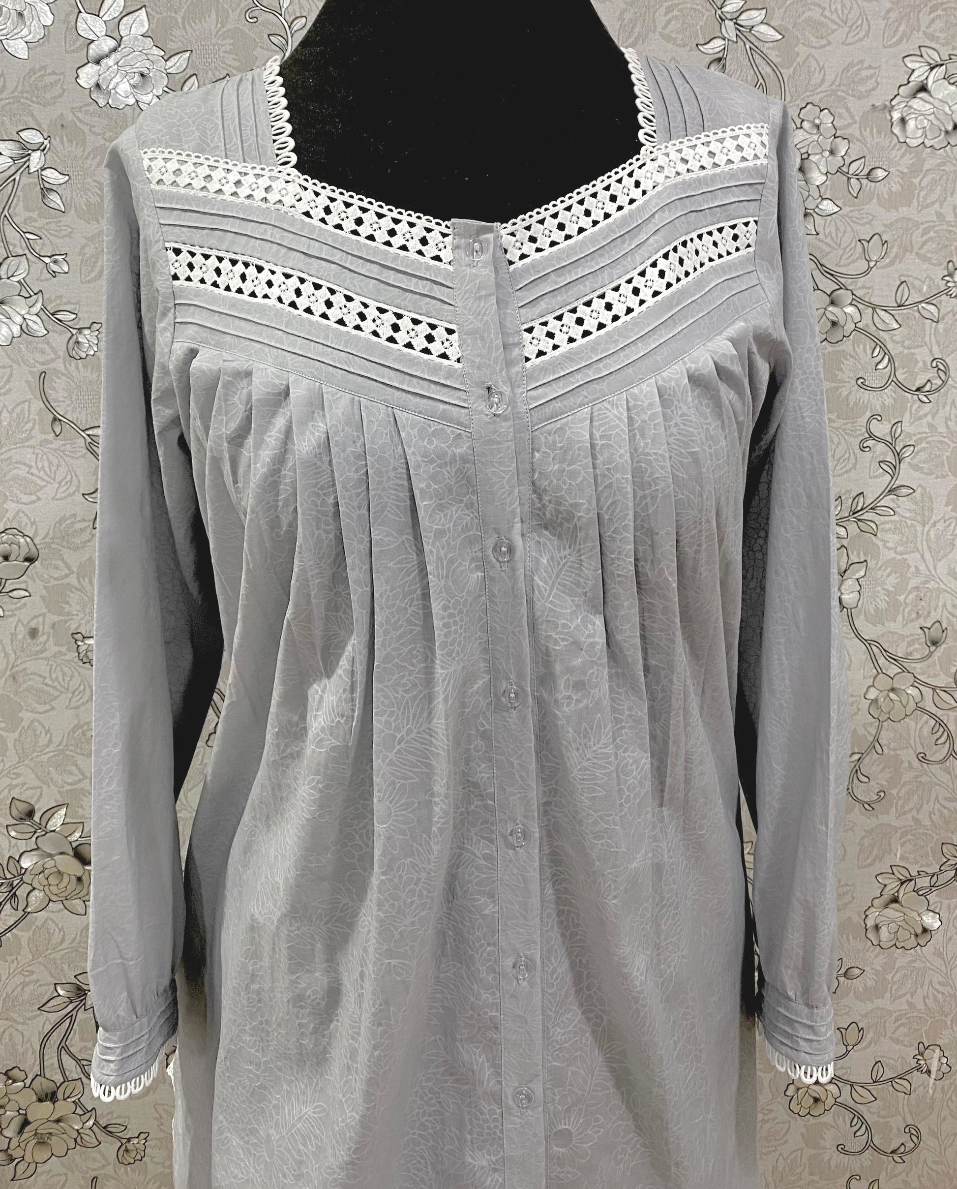 The SoieRose SR-1230 nightgown brings together refined Victorian design and modern comfort. Crafted from 100% cotton with a soft jacquard texture, it features a beautifully structured yoke with pintuck detailing and intricate lace inserts. The full button-down front and lace-edged sleeves add to its timeless grace, making it ideal for restful nights or relaxed mornings.