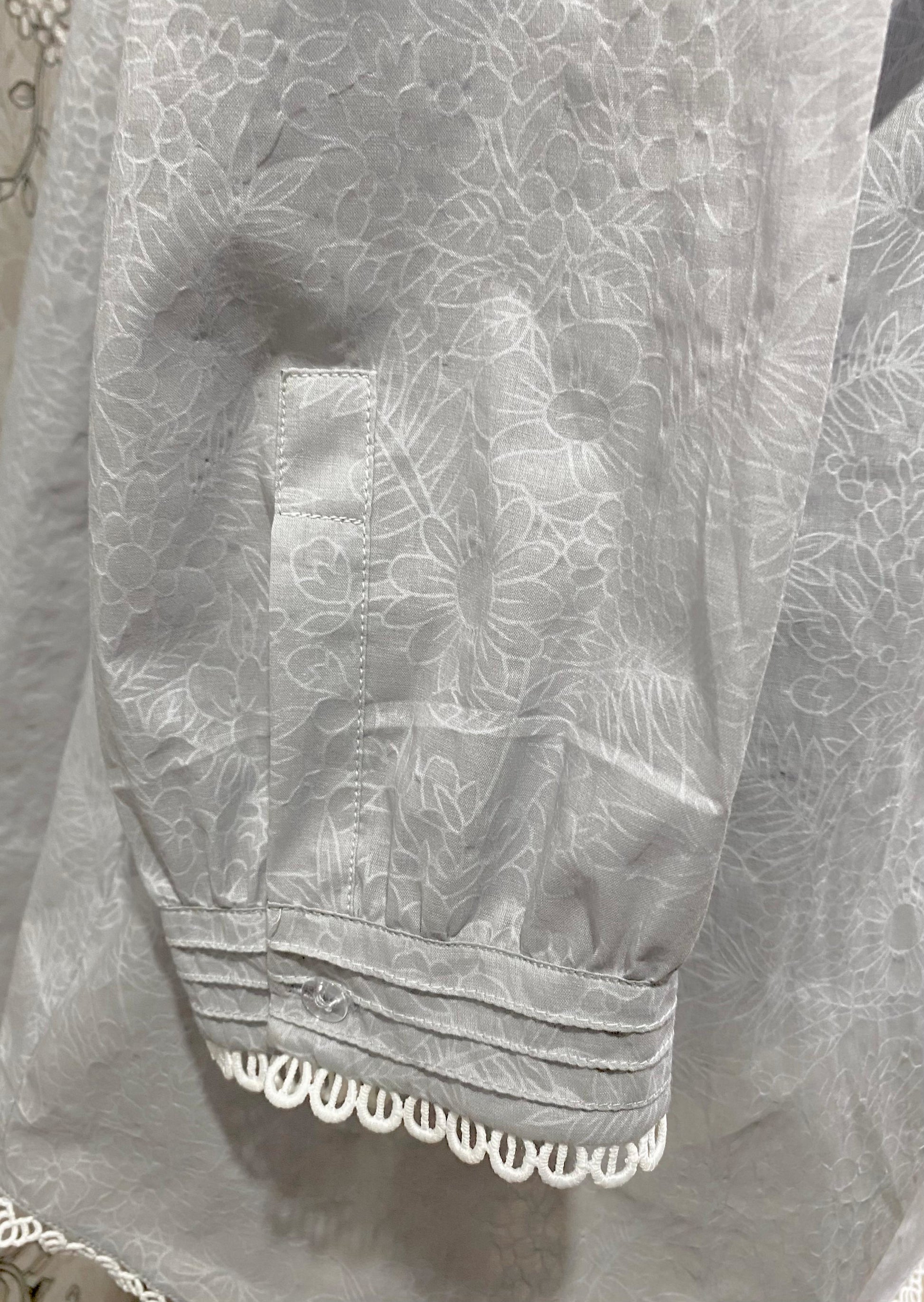 • Button-front design with lace trim on cuffs and hem for a classic finish